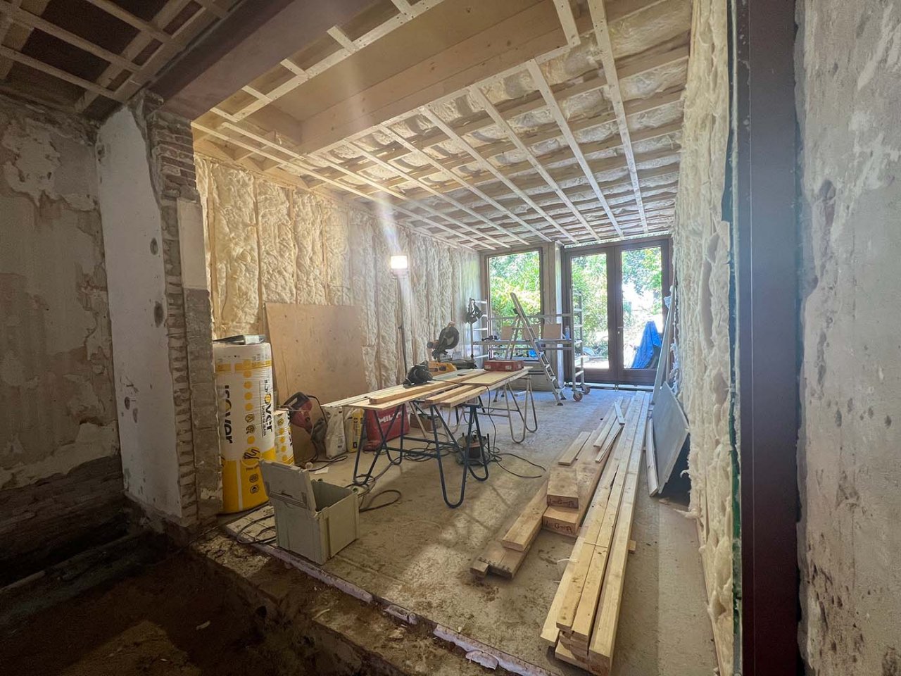 Twee maanden geleden begon ons team aan dit project. Om plaats te maken voor een nieuwe indeling was het noodzakelijk dat er sloopwerkzaamheden gedaan werden. Na het sloopwerk maakten onze timmermannen een nieuwe vloer in de woning en voor de uitbreiding en isolatiewanden voor de uitbouw. Het kozijn met openslaande deuren in de uitbouw komt uit de timmerfabriek.